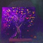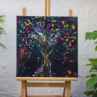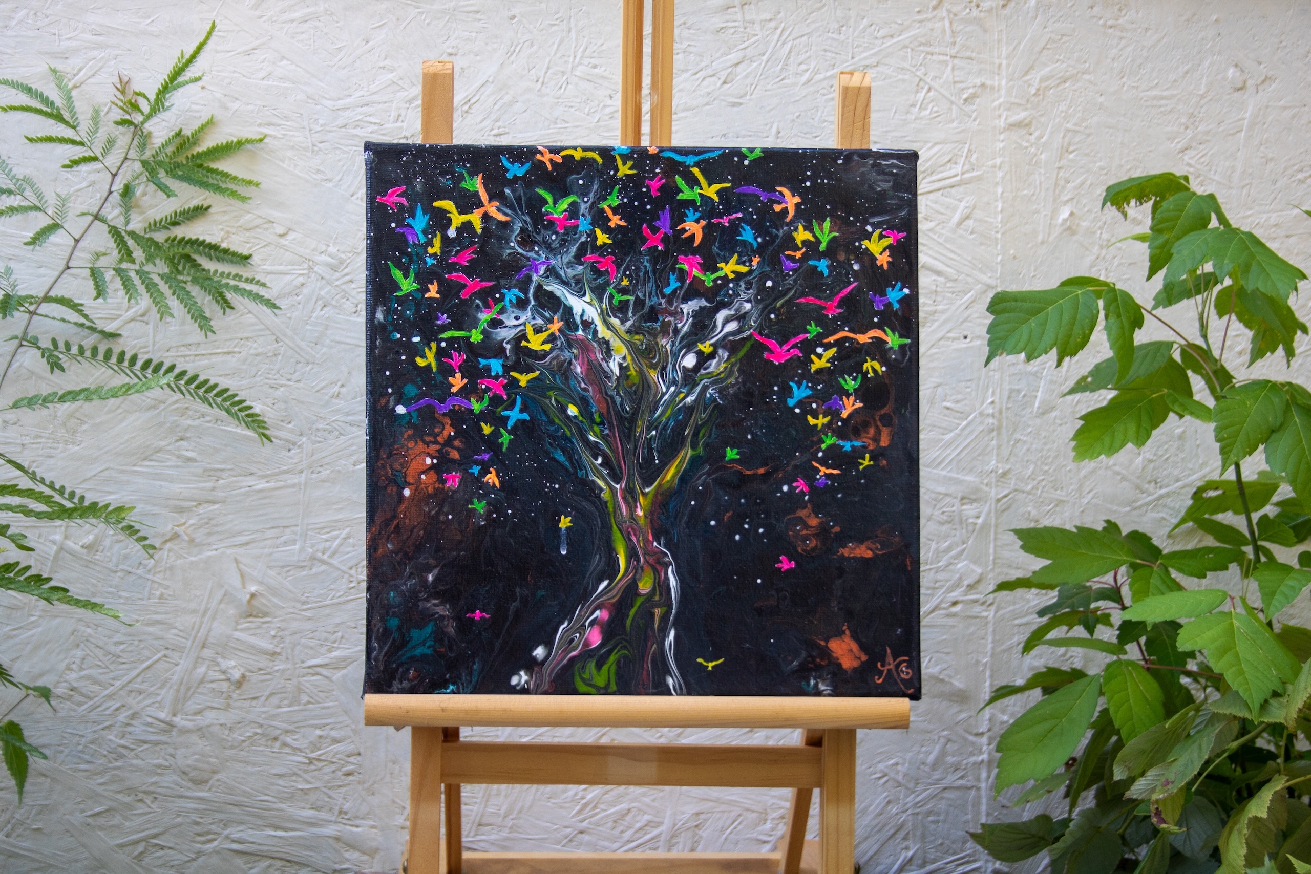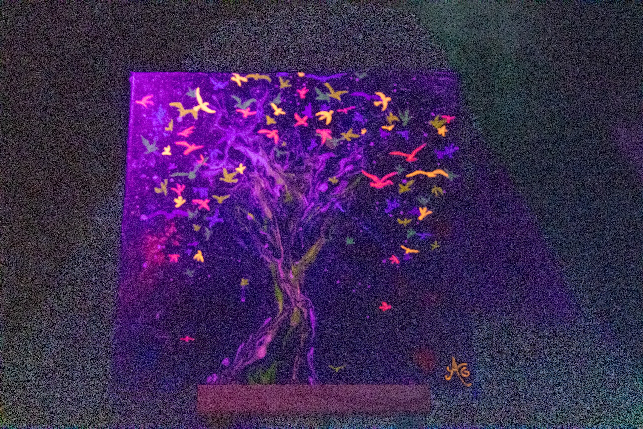 Tableau à la peinture liquide (pouring) d’un mélange d’acrylique classique et d’acrylique fluorescente